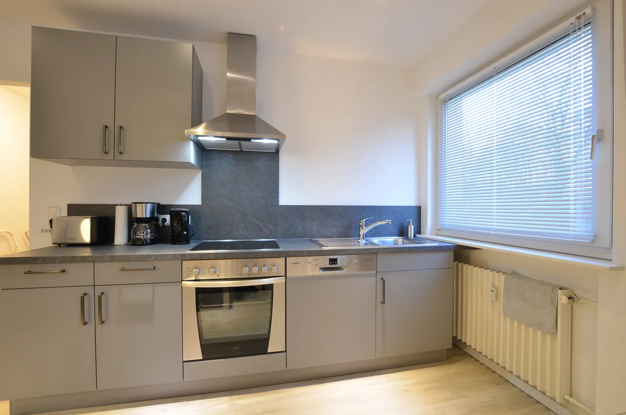 Voll ausgestattete Küche inkl. Spülmaschine, Herd mit Ceran-Kochfeld, Dunstabzugshaube, Backofen, Spüle, Mikrowelle, Kühl- und Gefrierkombination und viele weitere Elektrogeräte wie Toaster, Kaffeemaschine, Wasserkocher, Stabmixer etc.