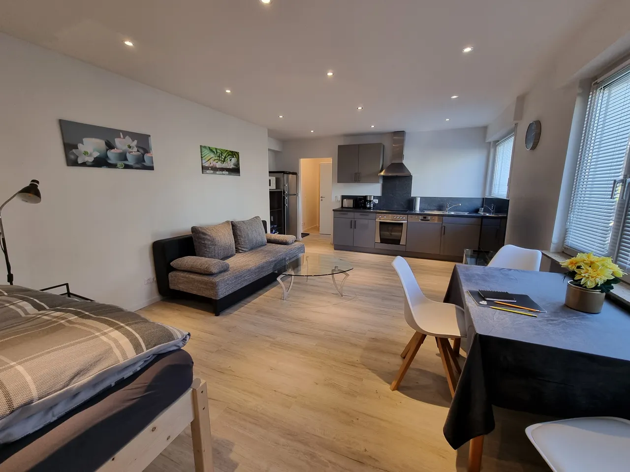 Offener Wohn- und Schlafraum mit Küche und Essbereich