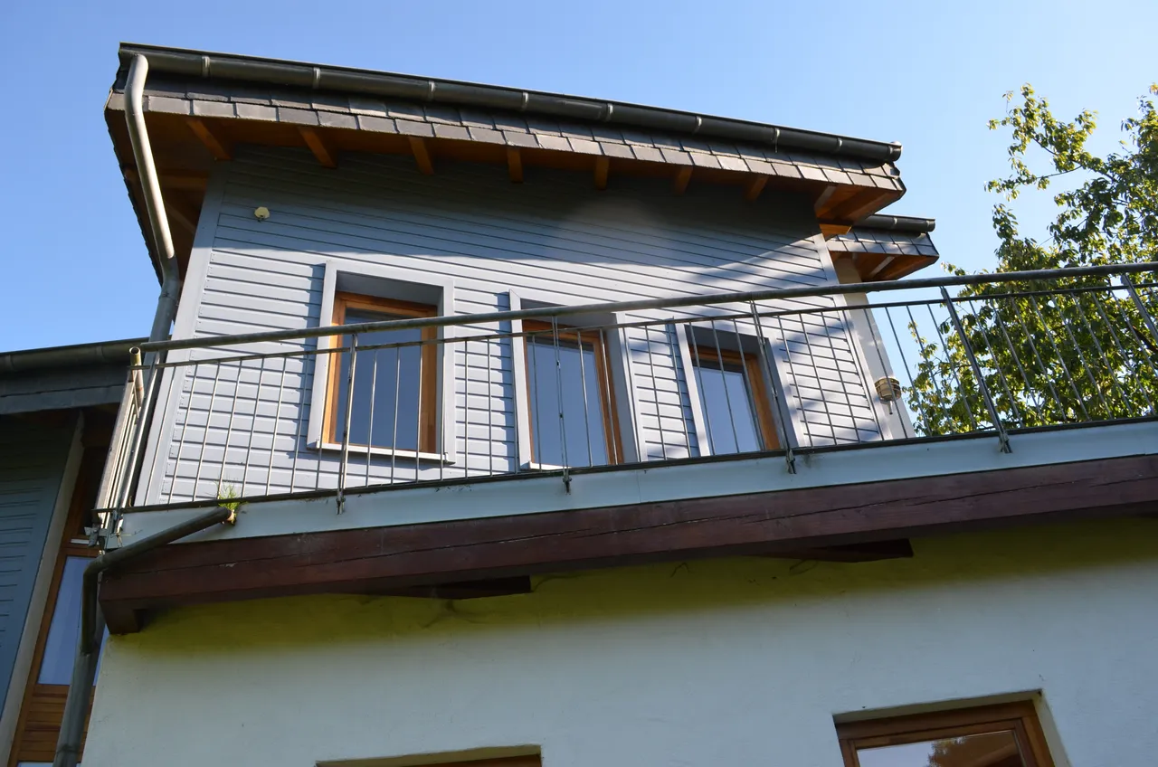 Das gesamte Dach ist als Thermodach mit Betondachsteinen (Taunus-Pfanne, granit) hergestellt.