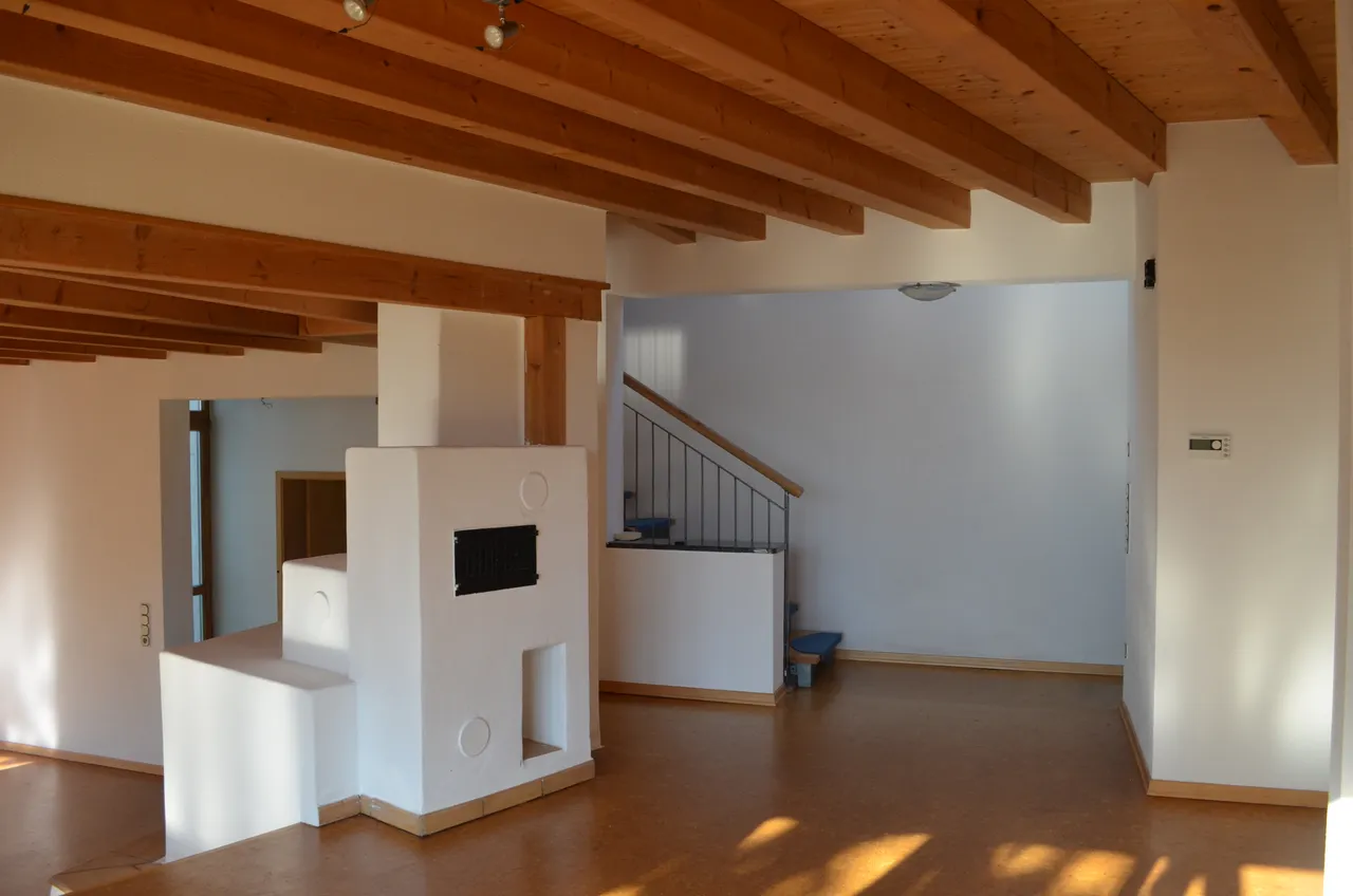 Weitere Besonderheiten sind die Holzbalkendecken aus hellem Holz, die optisch gegliedert sind und von starken Balken getragen werden.