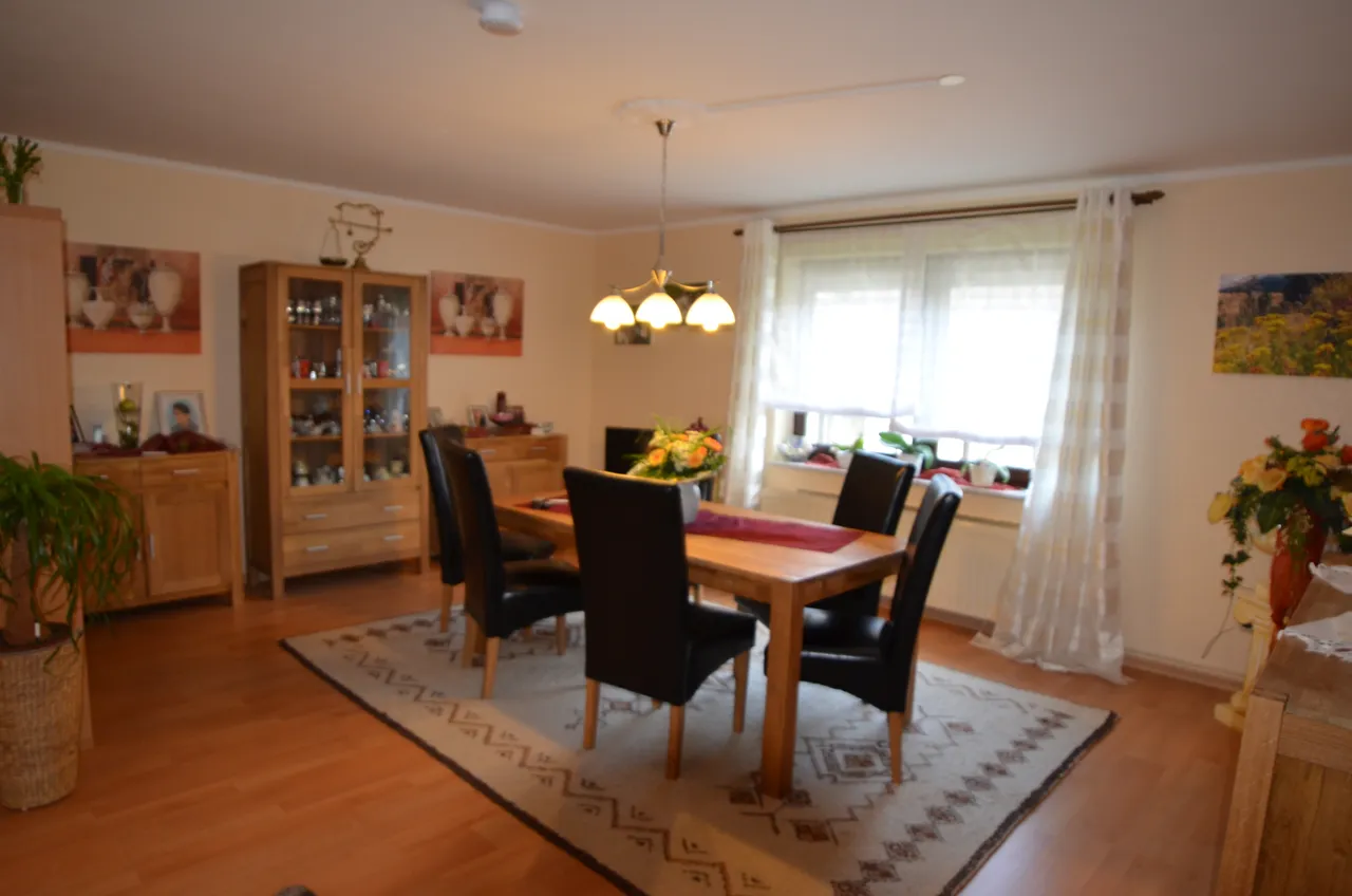 Das gut geschnittene Esszimmer bietet viel Platz und einen Ausblick auf die dazu gehörige offene Küche.