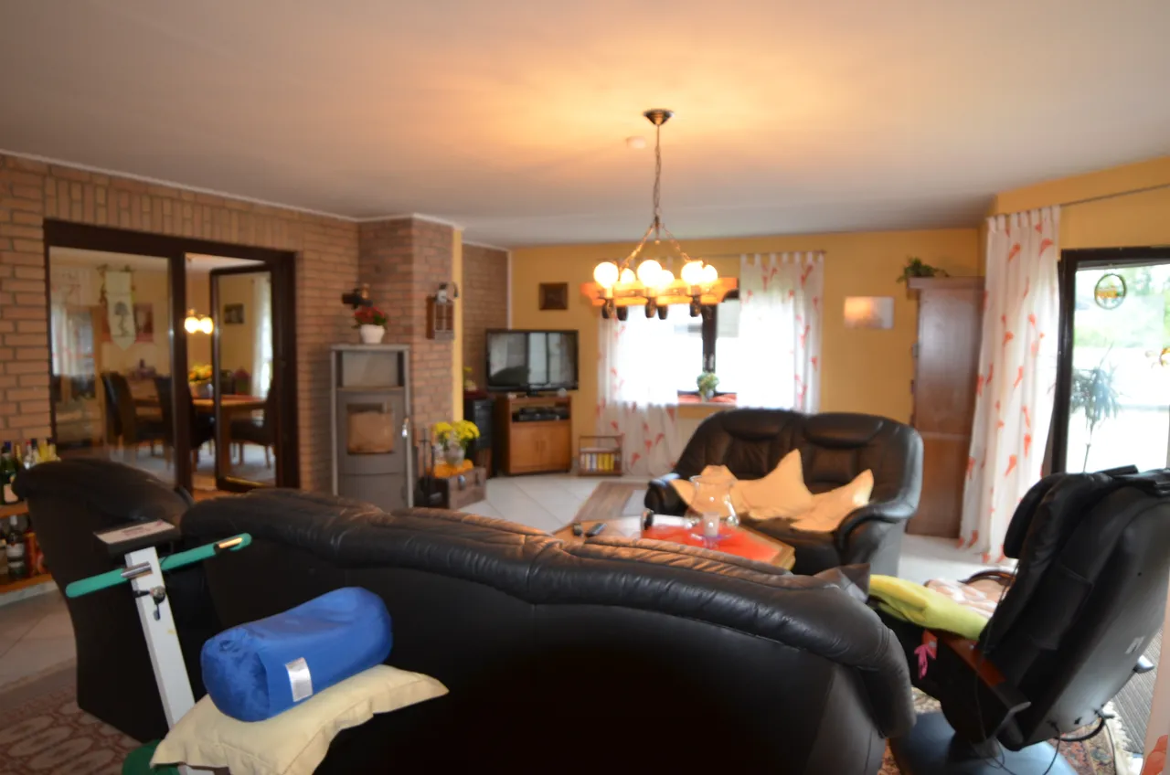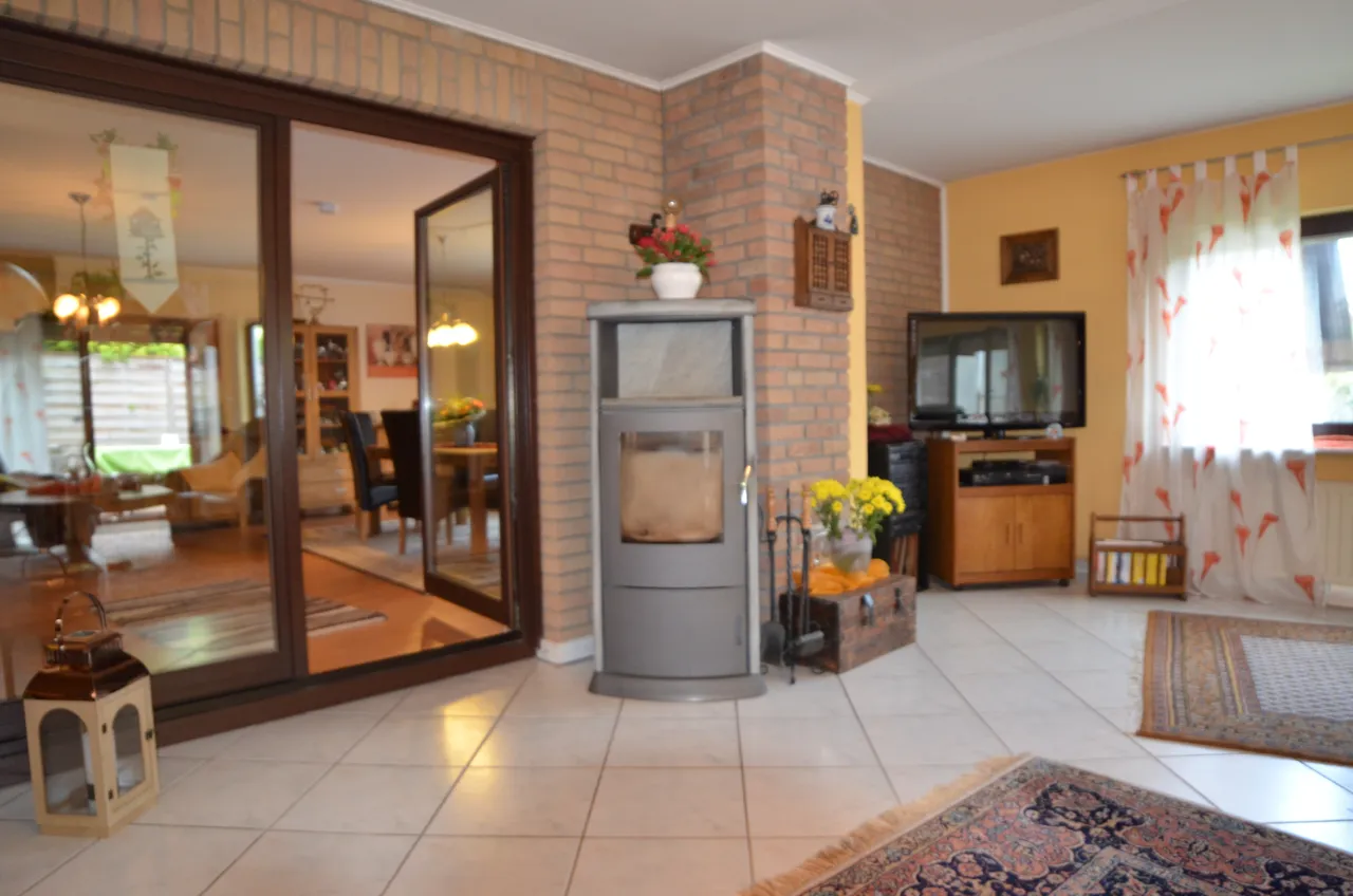 Neben dem Kamin, der im Wohnzimmer heimelige Wärme ausstrahlt, können Sie durch die großen Fensterfronten und Terrassentüren ebenfalls viel Sonne genießen.