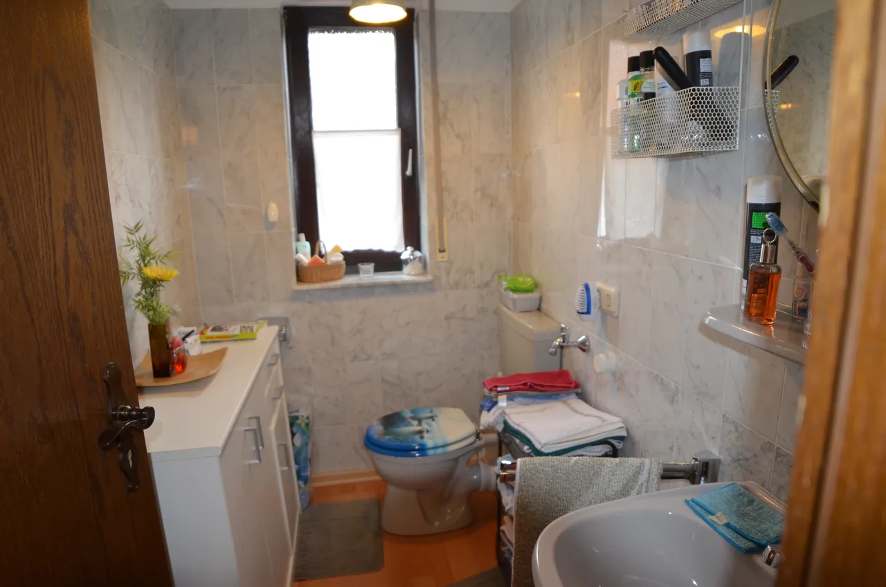 Hieran grenzt das geräumige Badezimmer mit Badewanne, Dusche und hellem Tageslicht.