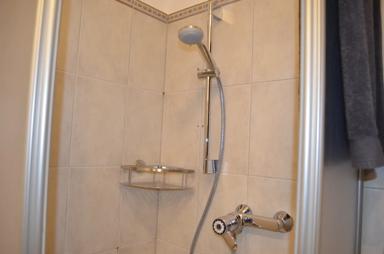 Das Duschbad ist mit pflegeleichten, hellen Fliesen und die anderen Räume mit neuem Laminat ausgestattet.