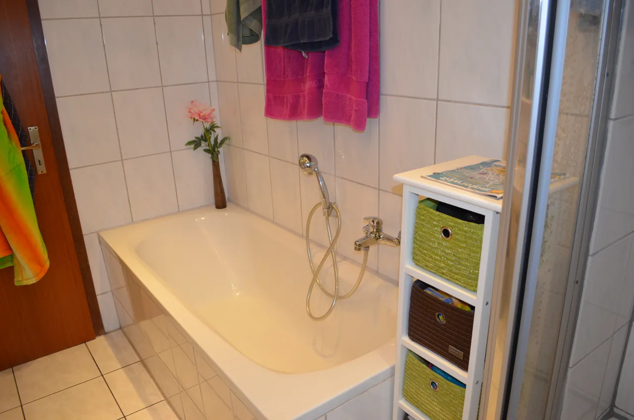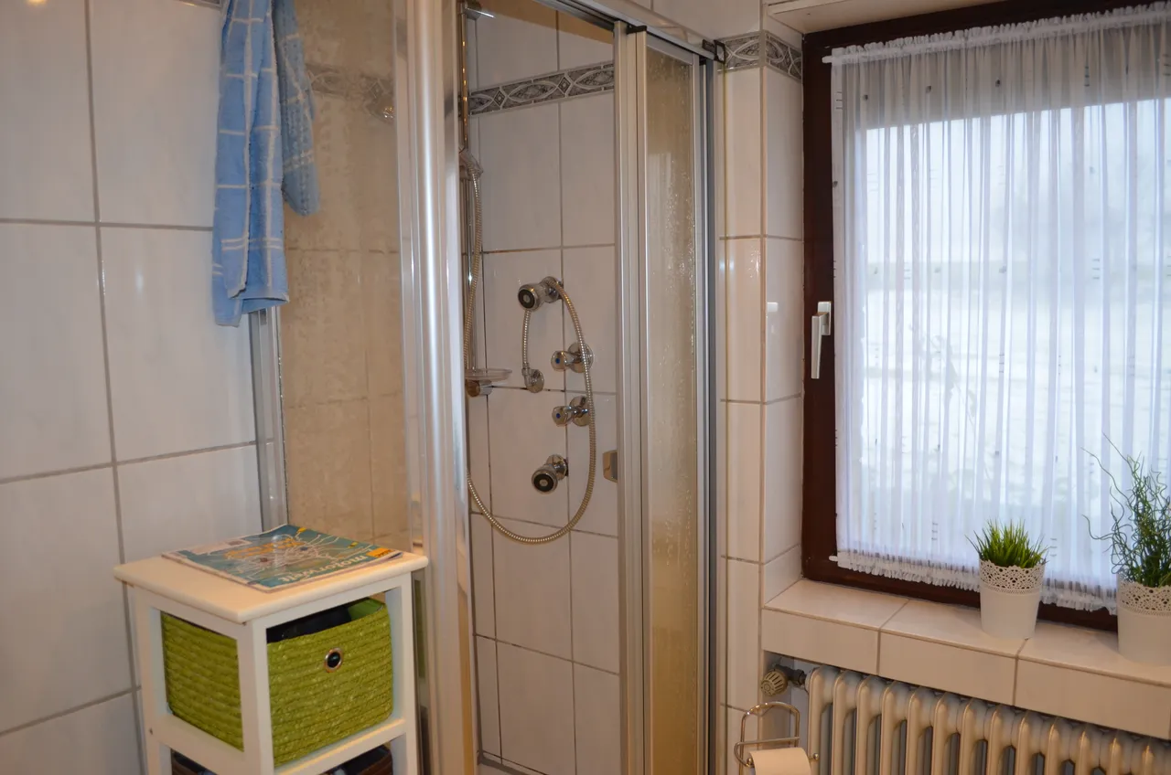 4 Zimmer, Küche, Diele, Abstellraum, Bad mit Dusche und Badewanne.