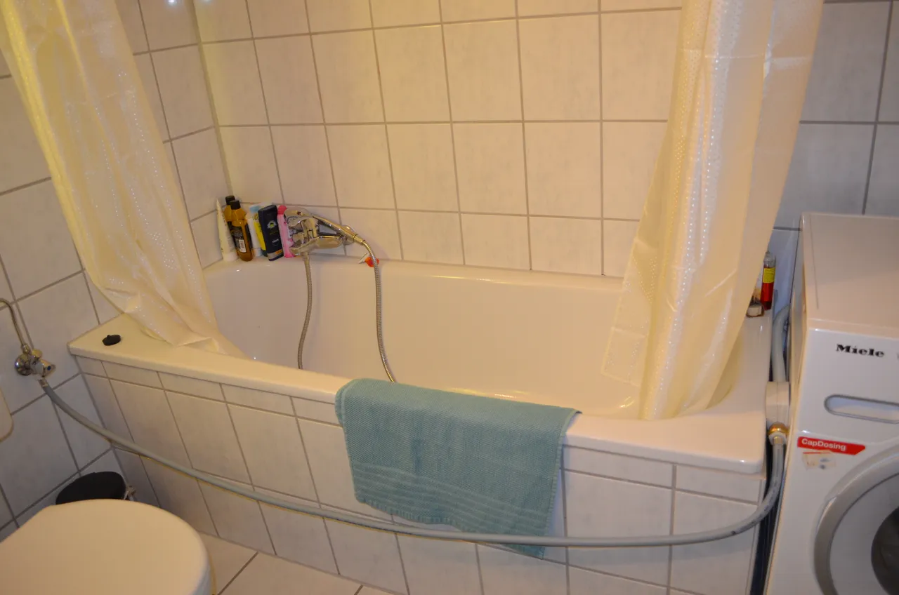 Das Bad mit Badewanne ist mit pflegeleichten, hellen Fliesen und die anderen Räume mit Laminat ausgestattet.